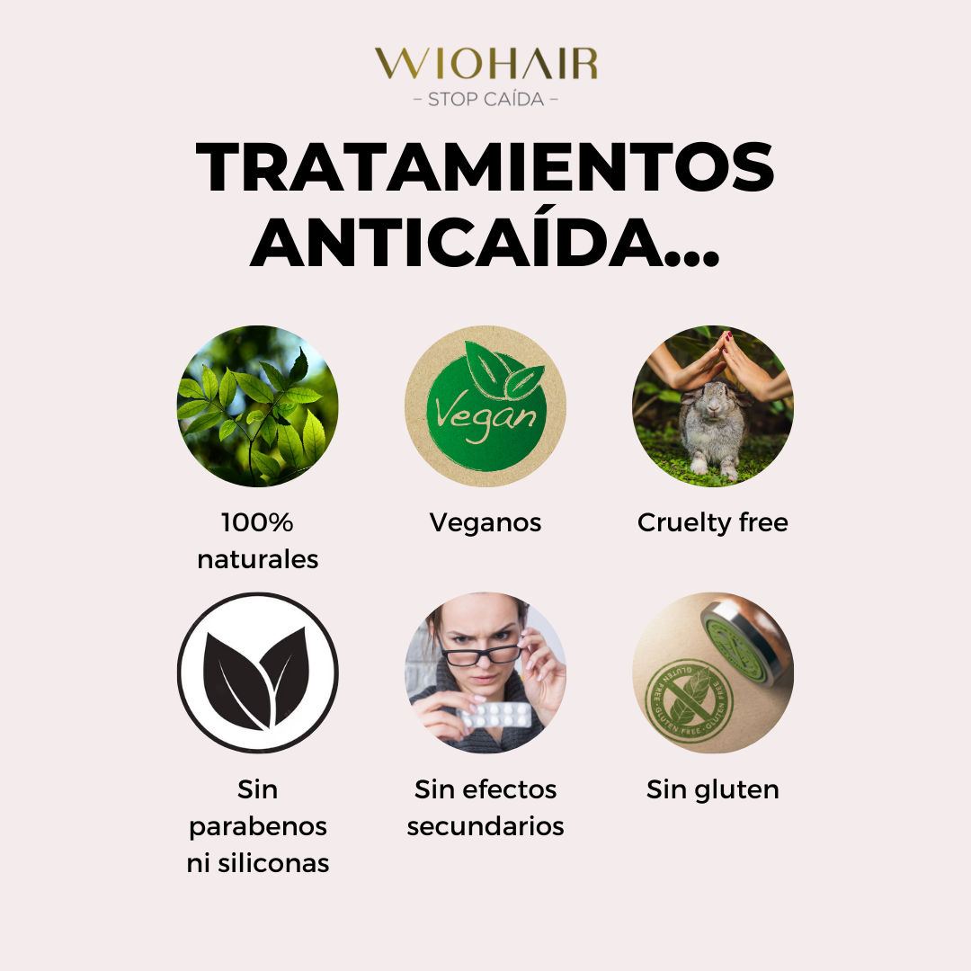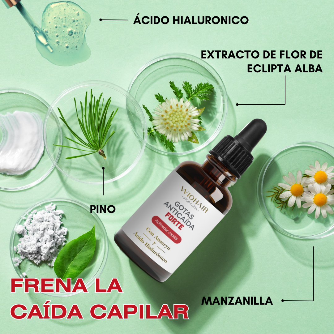 Las Gotas Anticaída de WIOHAIR son una solución holística 4 en 1. Actúan como activador capilar para frenar rápidamente la caída y aumentan el crecimiento del cabello sin fármacos gracias al Anacryn® (extracto de flor de Eclipta Alba). Además, contribuyen a mejorar la densidad capilar y cuidan el cuero cabelludo gracias a su fórmula con ácido hialurónico y 12 extractos vegetales: árnica, bardana, berro, caléndula, capuchina, hiedra, limón, manzanilla, ortiga blanca, pino, romero y salvia que ayudan a regular la grasa y la caspa.